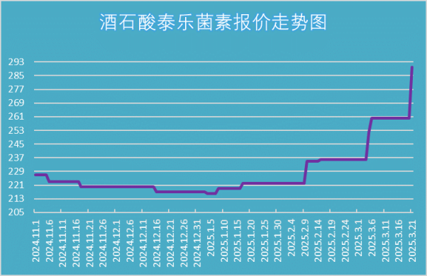 在獸藥原料市場劇烈震蕩的2025年第一季度,酒石酸泰樂菌素價格曲線呈現(xiàn)陡峭上升態(tài)勢。截至3月21日,寧夏泰益欣生物酒石酸泰樂菌素報價已達290元/千克(市場實際成交價280元/千克),較年初基準價累計上漲23.5%,創(chuàng)下該品類近兩年價格峰值。這場看似由產(chǎn)能收縮引發(fā)的市場異動,實則折射出中國獸藥產(chǎn)業(yè)從粗放擴張向高端品牌與技術驅動轉型的深層變革。