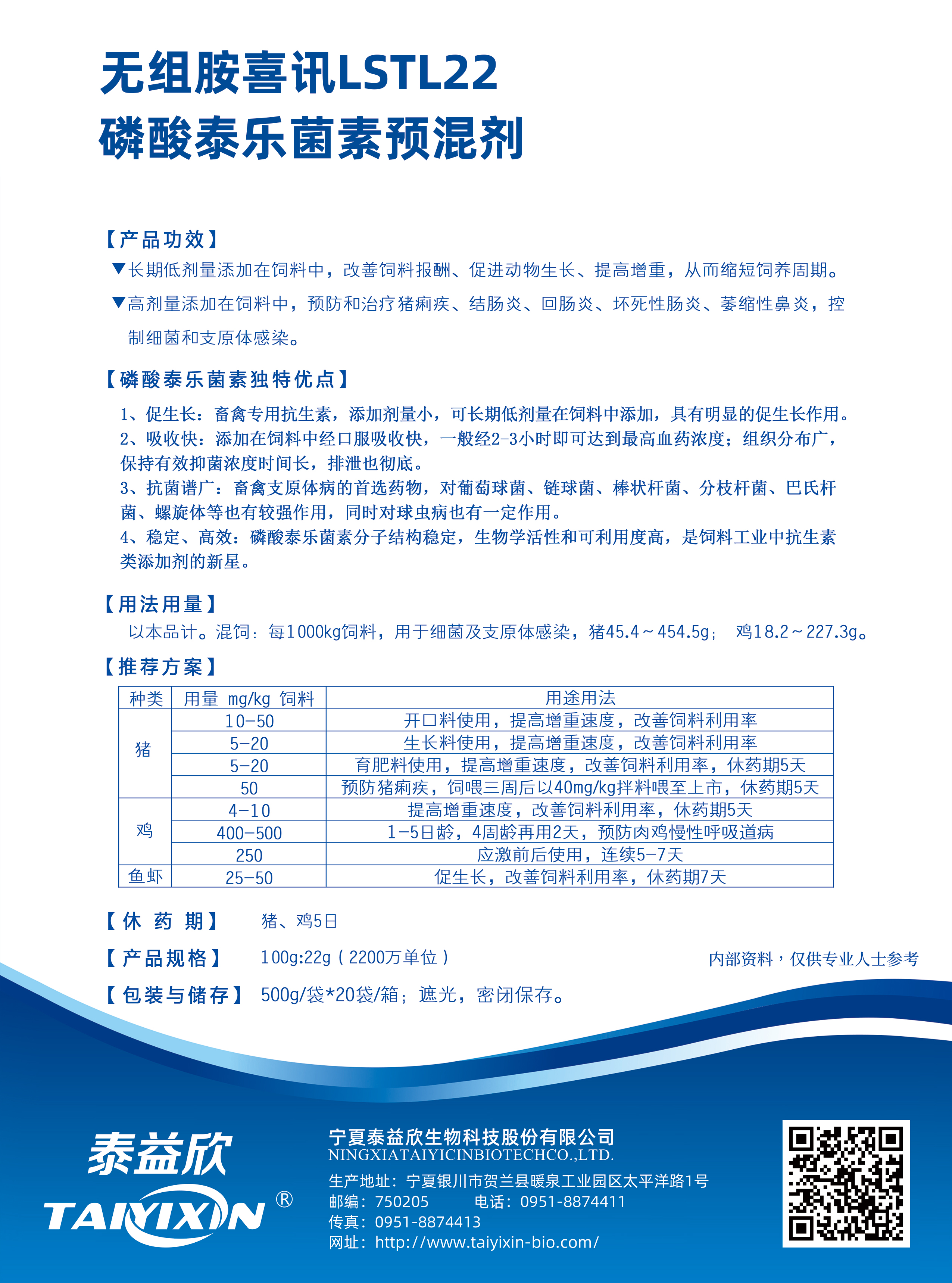 長期低劑量添加在飼料中,改善飼料報酬、促進動物生長、提高增重,從而縮短飼養(yǎng)周期。高劑量添加在飼料中,預(yù)防和治療豬痢疾、結(jié)腸炎、回腸炎、壞死性腸炎、萎縮性鼻炎,控制細(xì)菌和支原體感染。