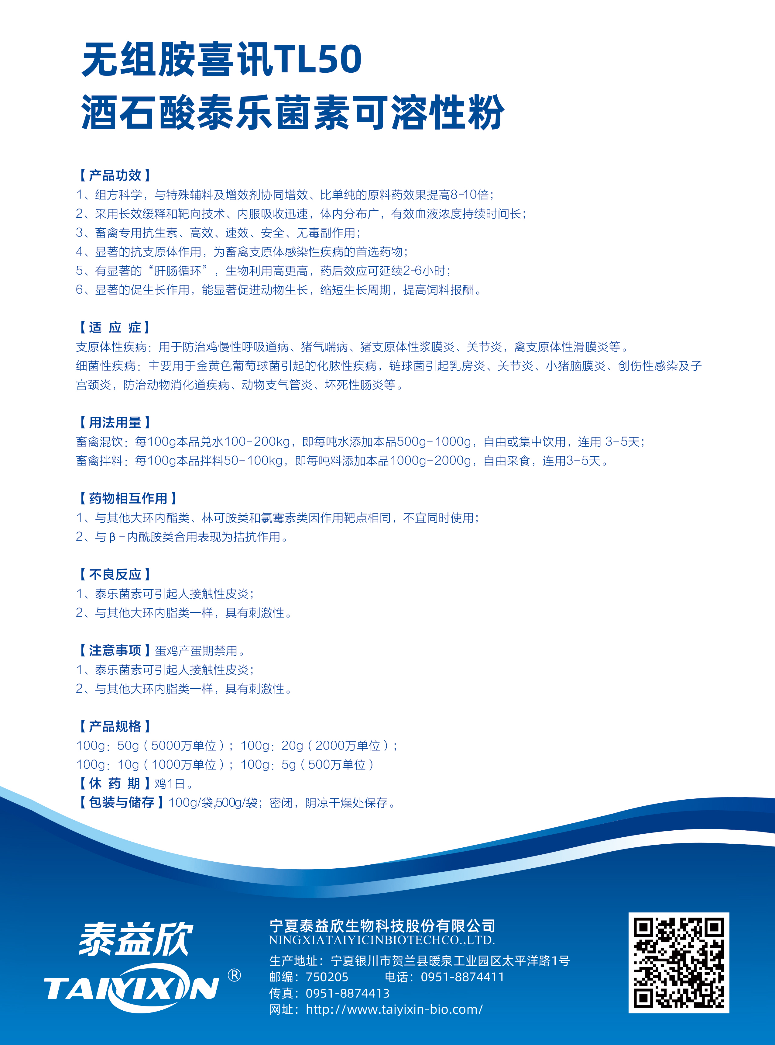酒石酸泰萬菌素對許多革蘭氏陽性菌及某些陰性菌有抵抗活性,包括支原體、弧菌、螺旋菌和大病毒,對雞敗血支原體、豬流行性肺炎、豬赤痢等有獨特的療效,并適用于住猥瑣性鼻炎、禽霍亂、雞慢性呼吸道疾病、小牛支原體引起的肺炎等疾病的預(yù)防和治療。本品具有比泰樂菌素更寬的安全系數(shù),是對禽畜支原體病有明顯療效的理想藥物。